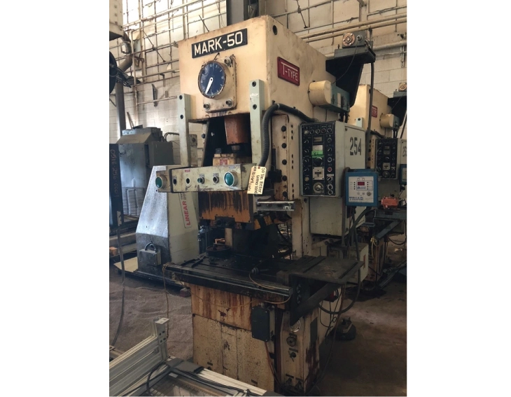 Used Heller Sutherland MARK 50 OBI Gap Press, 50 Ton capacity, single crank, with cushion and Trabon lubrication. Specs: 33"x17.3" bed, 4.3" stroke, 10.6" die height, variable speeds 50-85 SPM. 1988 model in used condition.