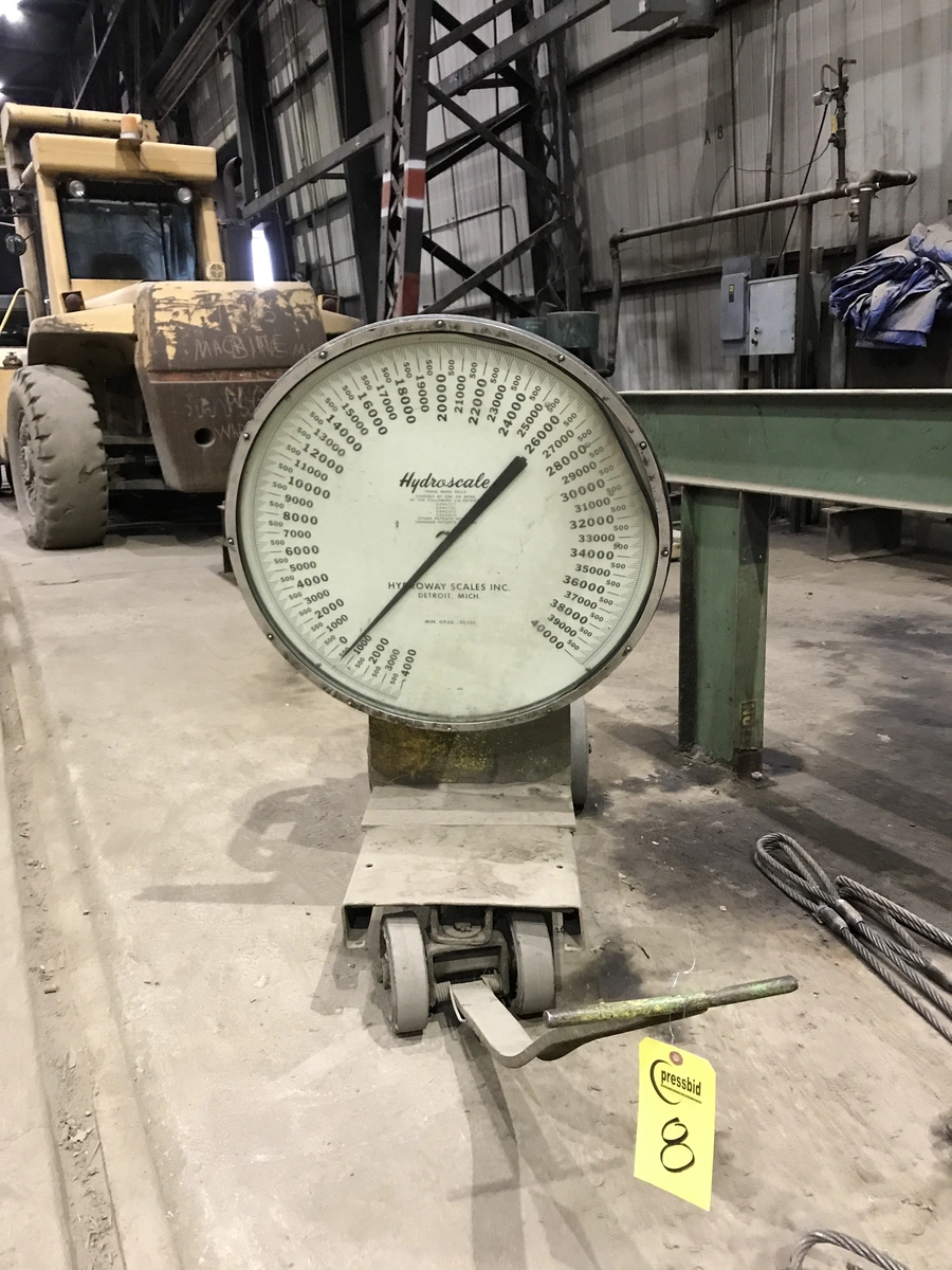 (1) Used 40,000 Lbs Hydroscale Hanging Crane Scale and Rolling Stand